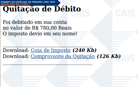 | comentário | A mensagem informa que foram debitados R$ 780, 00 da conta da vítima para o pagamento de impostos. O link para o suposto comprovante leva ao arquivo malicioso que foi identificado como Gen:Trojan.Heur.VP.nm0@aO72cTji (BitDefender). | |