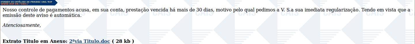 | comentário | A mensagem contém apenas apenas um link referente a algum tipo de cobrança. O conteúdo malicioso já havia sido removido no momento da análise. | |