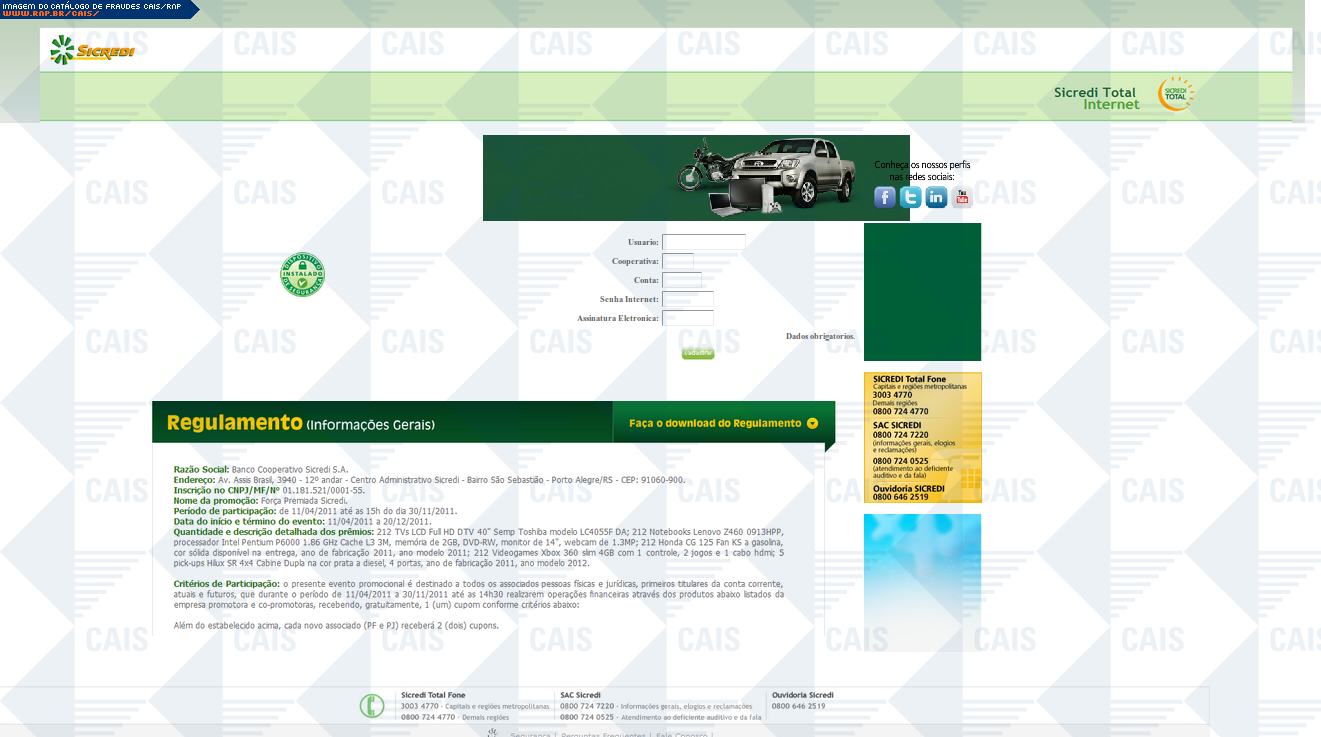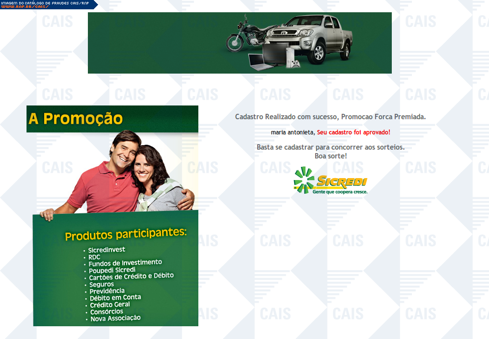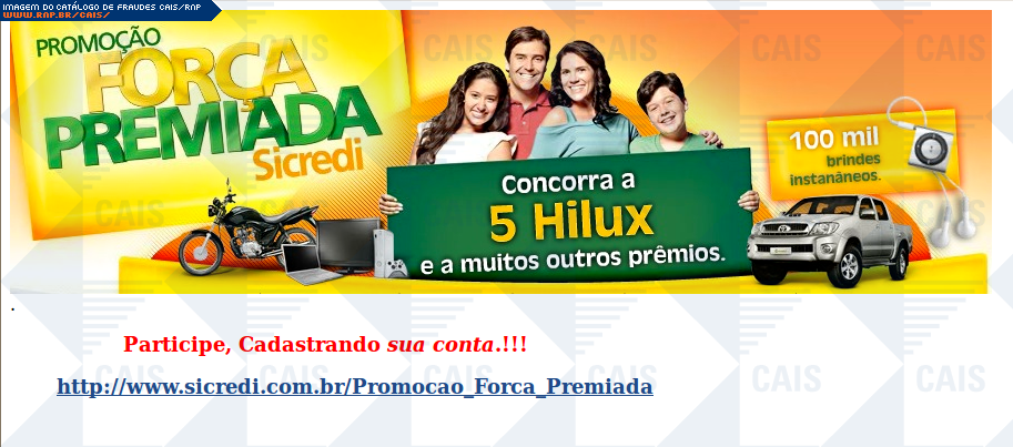 | comentário | Mensagem falsa em que a Sicredi estaria anunciando uma promoção. O link para o cadastro na suposta promoção leva a uma página falsa, destinada a roubar dados da conta bancária da vítima. | |