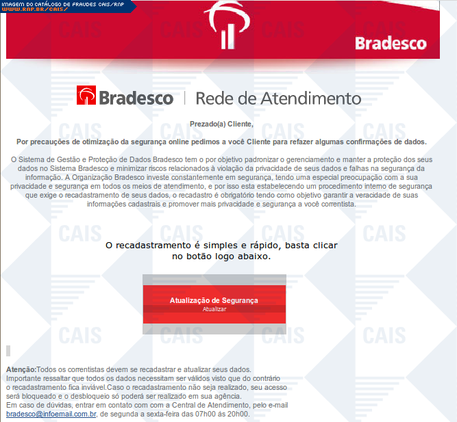 | comentário | A fraude usa o nome do banco Bradesco para tentar aliciar a vítima a realizar uma falsa atualização de segurança. O conteúdo malicioso não estava disponível no momento da análise. | |