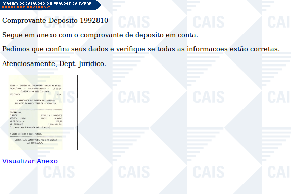 | comentário | A mensagem se passa pelo envio de um comprovante de depósito. O link para o suposto comprovante leva ao softeware malicioso que foi identificado como Backdoor.Win32.Turkojan (Ikarus). | |