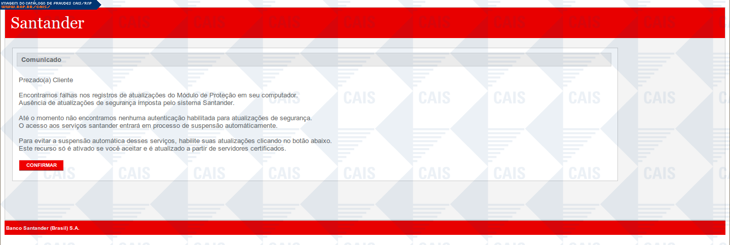 Esta página tem função informativa e educativa. Exibe uma coleção de imagens de phishing scam (fraudes eletrônicas) ou malware (código malicioso) veiculados por meio de spam (e-mail não-solicitado). Trata-se de conteúdo exemplificativo, não exaustivo, uma vez que não é possível contemplar todos os casos de fraudes existentes. Assim, caso você tenha conhecimento de um exemplar que não esteja aqui presente, isto não significa que não seja válido ou real. Inclusive incentivamos que você o envie para análise do CAIS para que, se for o caso, passe a integrar o nosso acervo.