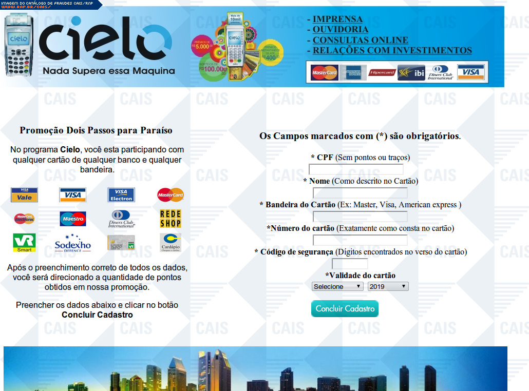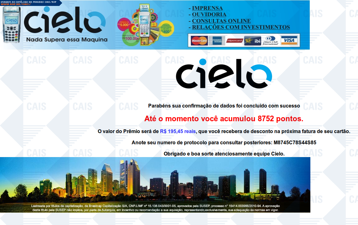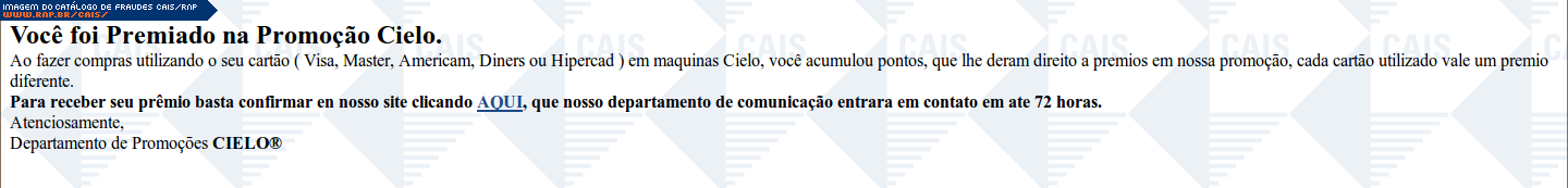 | comentário | A mensagem informa que a vítima foi premiada em uma promoção da Cielo. O link para o restate do suposto prêmio leva a uma página falsa destinada a roubar dados do cartão de crédito da vítima. | |