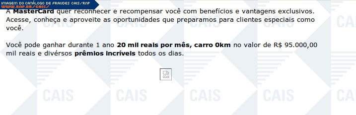 | comentário | A mensagem, em nome da mastercard, se passa pelo anúncio de uma suposta promoção. O conteúdo malicioso não estava disponível no momento da análise. | |