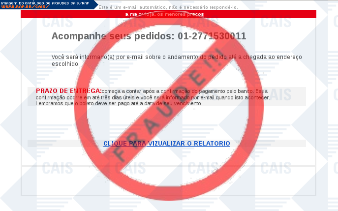 Esta página tem função informativa e educativa. Exibe uma coleção de imagens de phishing scam (fraudes eletrônicas) ou malware (código malicioso) veiculados por meio de spam (e-mail não-solicitado). Trata-se de conteúdo exemplificativo, não exaustivo, uma vez que não é possível contemplar todos os casos de fraudes existentes. Assim, caso você tenha conhecimento de um exemplar que não esteja aqui presente, isto não significa que não seja válido ou real. Inclusive incentivamos que você o envie para análise do CAIS para que, se for o caso, passe a integrar o nosso acervo.