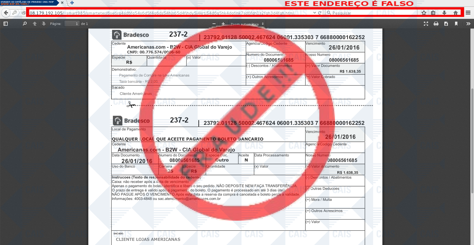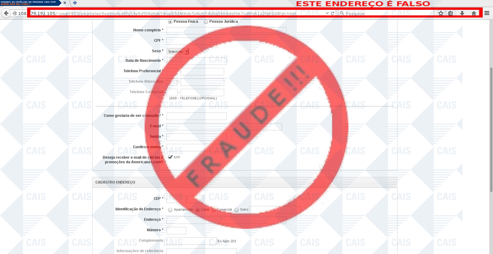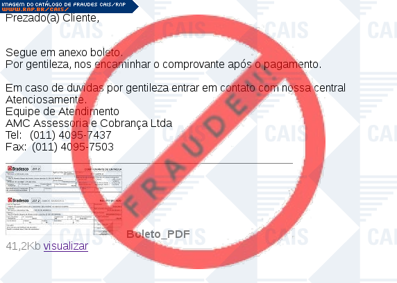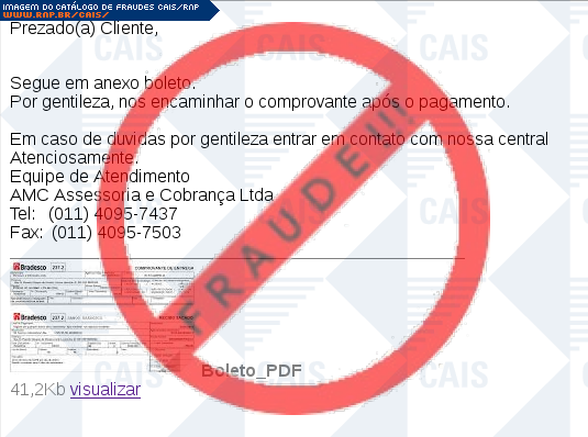 Esta página tem função informativa e educativa. Exibe uma coleção de imagens de phishing scam (fraudes eletrônicas) ou malware (código malicioso) veiculados por meio de spam (e-mail não-solicitado). Trata-se de conteúdo exemplificativo, não exaustivo, uma vez que não é possível contemplar todos os casos de fraudes existentes. Assim, caso você tenha conhecimento de um exemplar que não esteja aqui presente, isto não significa que não seja válido ou real. Inclusive incentivamos que você o envie para análise do CAIS para que, se for o caso, passe a integrar o nosso acervo.