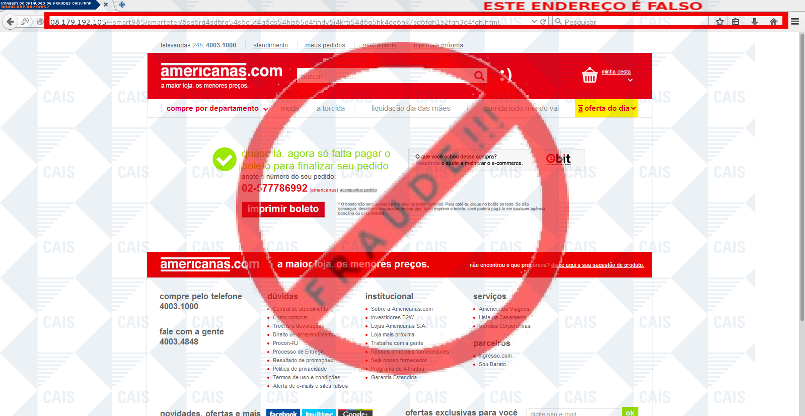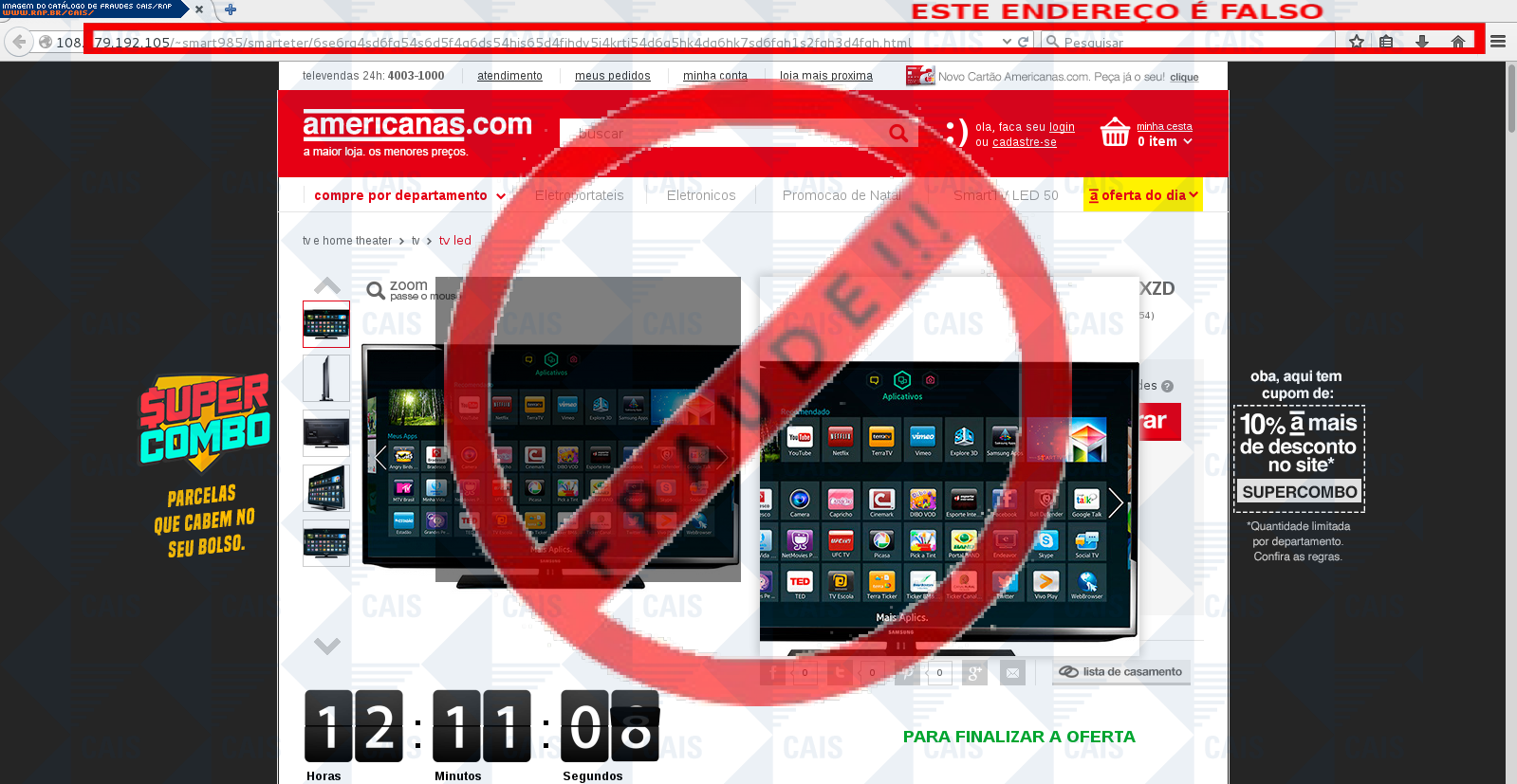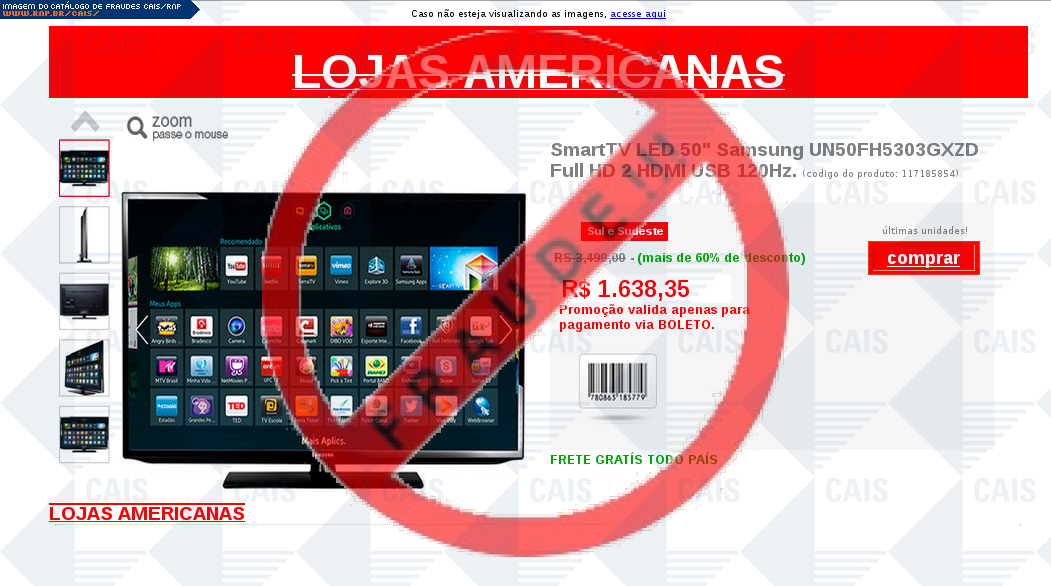 | comentário | A vítima recebe um email com uma suposta promoção de Smart TV das Lojas Americanas, com um link para a compra e impressão do boleto para pagamento. Entretanto, o link leva a uma página falsa, que tenta enganar a vítima fazendo com que ela pague um boleto... (leia mais) | |