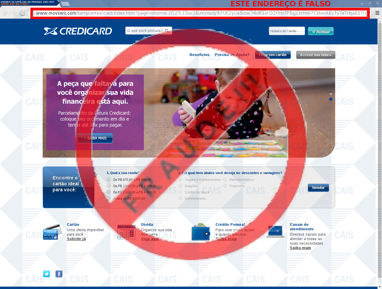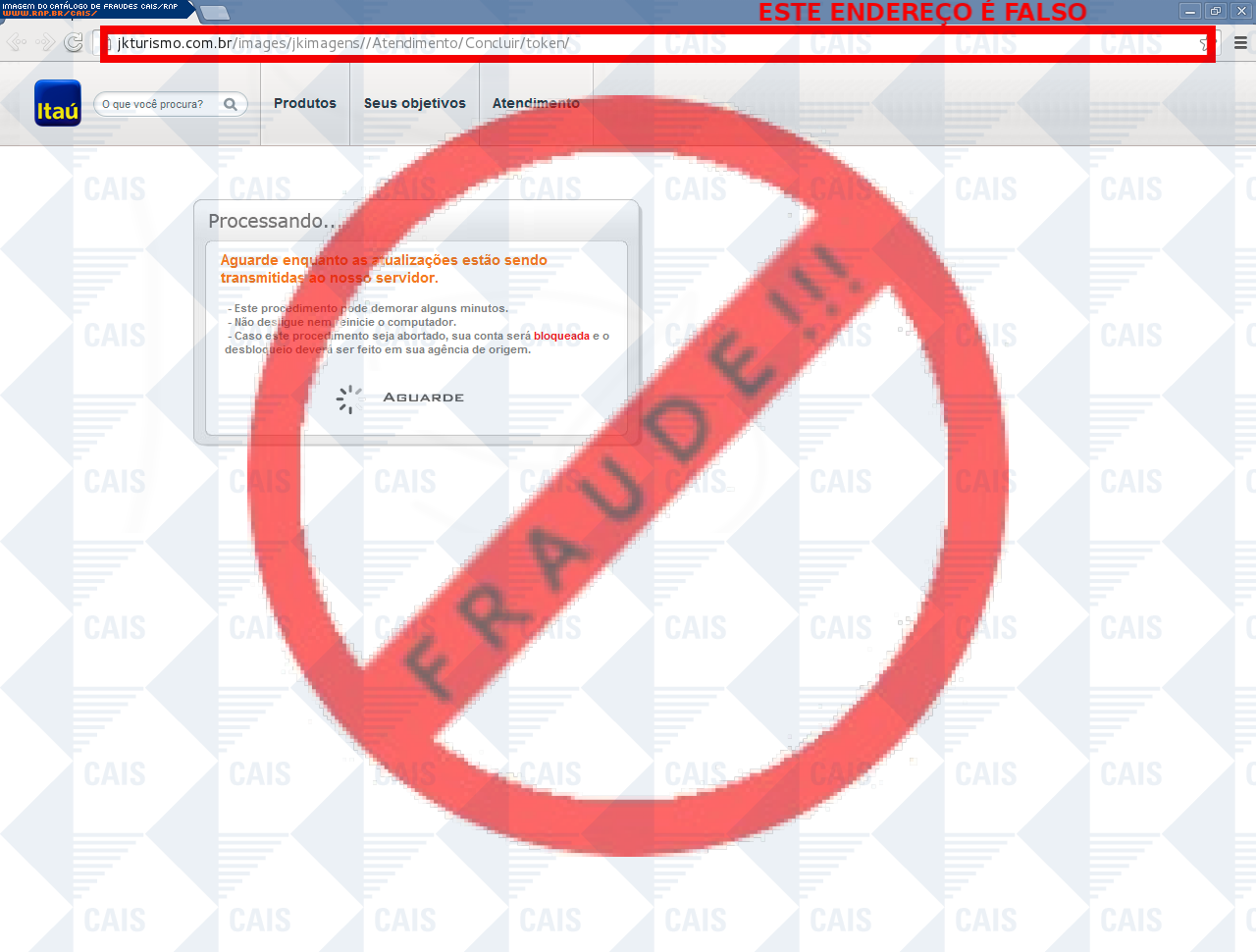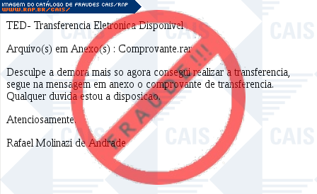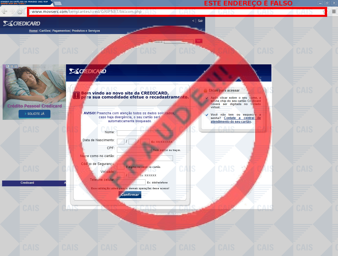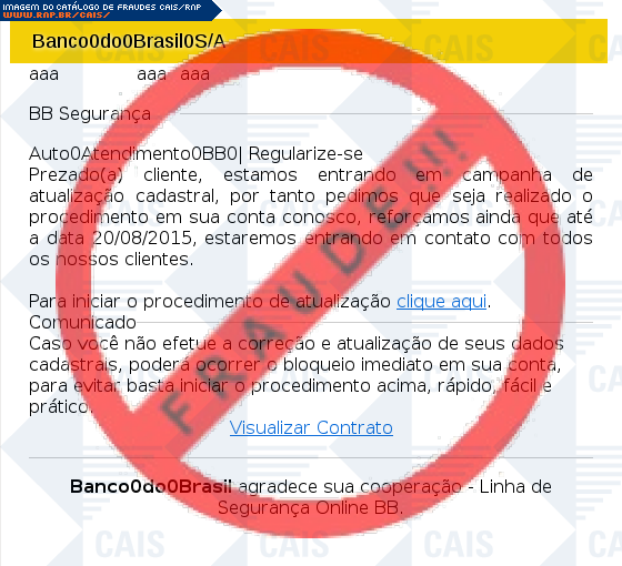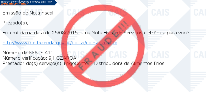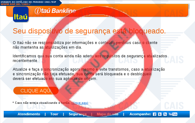 Esta página tem função informativa e educativa. Exibe uma coleção de imagens de phishing scam (fraudes eletrônicas) ou malware (código malicioso) veiculados por meio de spam (e-mail não-solicitado). Trata-se de conteúdo exemplificativo, não exaustivo, uma vez que não é possível contemplar todos os casos de fraudes existentes. Assim, caso você tenha conhecimento de um exemplar que não esteja aqui presente, isto não significa que não seja válido ou real. Inclusive incentivamos que você o envie para análise do CAIS para que, se for o caso, passe a integrar o nosso acervo.