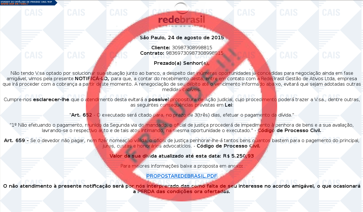 | comentário | O usuário recebe uma mensagem contendo uma notificação da RedeBrasil com uma cobrança referente a um contrato disponível para download, no entanto o arquivo originado é malicioso criado para roubar informações da vítima e instalar outros arquivos fraudulentos... (leia mais) | |