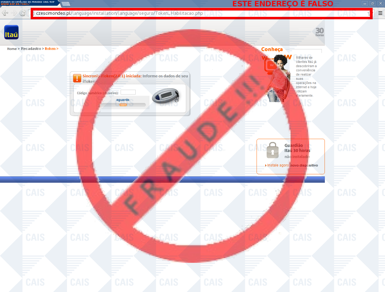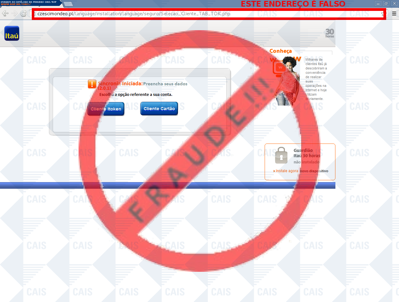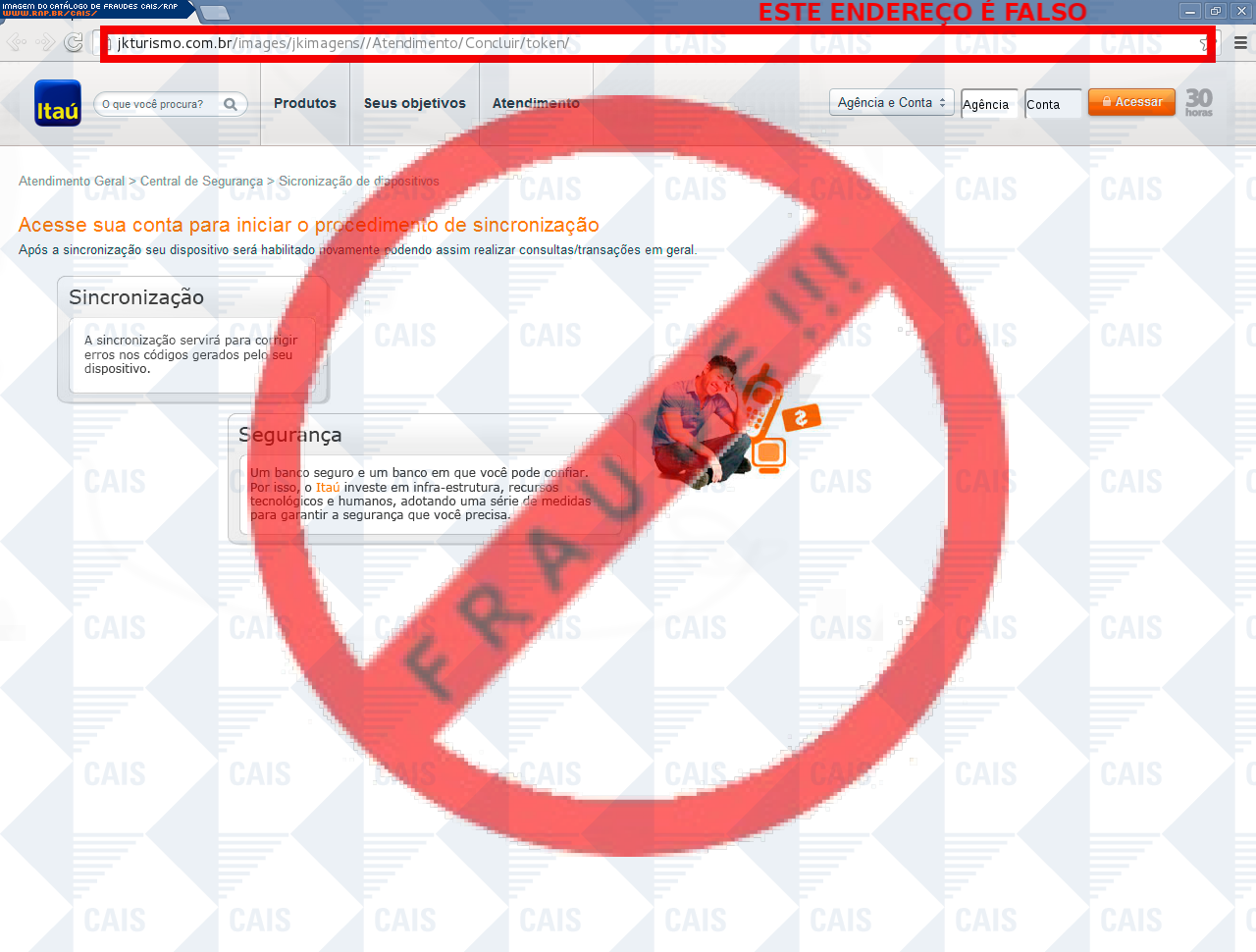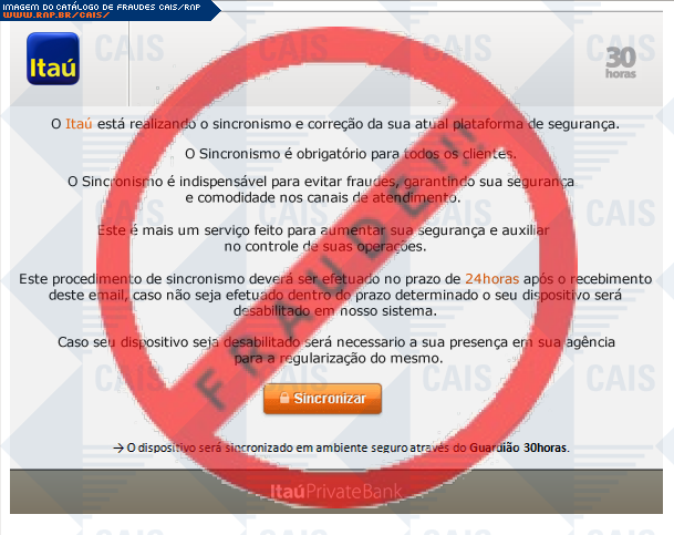 | comentário | A vítima recebe uma mensagem solicitando sincronização e correção de sua plataforma de segurança referente a conta no banco Itaú, no link disponível, entretanto a página é falsa criada para roubar os dados bancários do usuário. | |