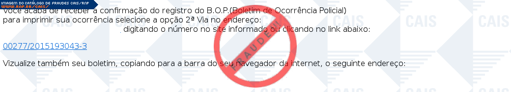 | comentário | A vítima recebe um email com uma suposta comfirmação de registro de boletim de ocorrência e com um link para download do mesmo. Porém, o link leva ao download de um malware de nome virus.vbs.down.a. | |