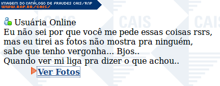 | comentário | Mensagem de suposta conhecida enviando fotos ítimas que teriam sido feitas "especialmente" para a vítima. A fraude contém um link para a visualização das fotos, esse link leva ao download de um malware identificado como Gen:Trojan.Heur.VP.ou1aaacZaZK (BitDefender).... (leia mais) | |