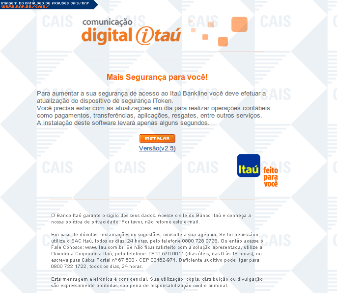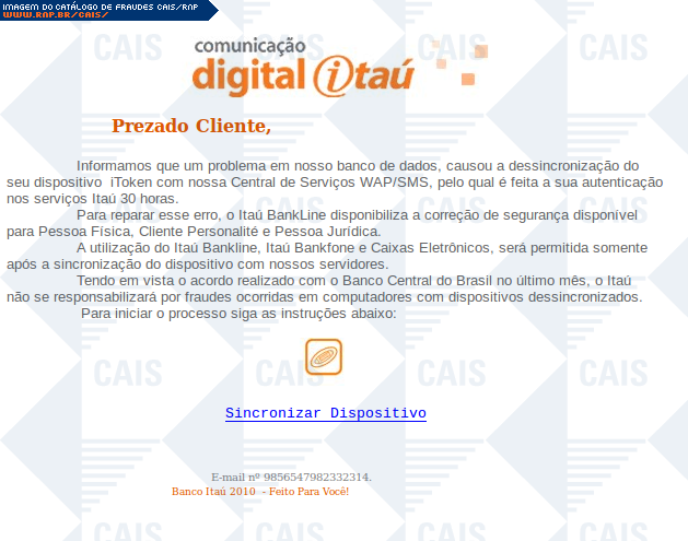 | comentário | Falso email do Itaú que orienta o cliente a atualizar o seu iToken devido a uma suposta desincronização com a central de serviços WAP/SMS. O arquivo indicado para atualização na mensagem é um malware identificado como Win32:Malware-gen (Avast). | |