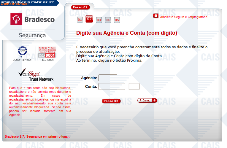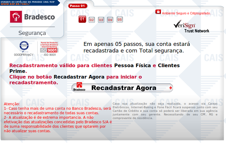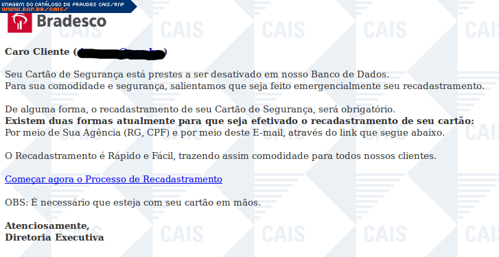 | comentário | Falso email que pede para que o cliente recadastre seu cartão de segurança, caso contrário terá seu cartão desativado. O Bradesco não tem como política recadastrar seus cartões de segurança, ainda mais pela internet. O site de recadastramento contido no email... (leia mais) | |