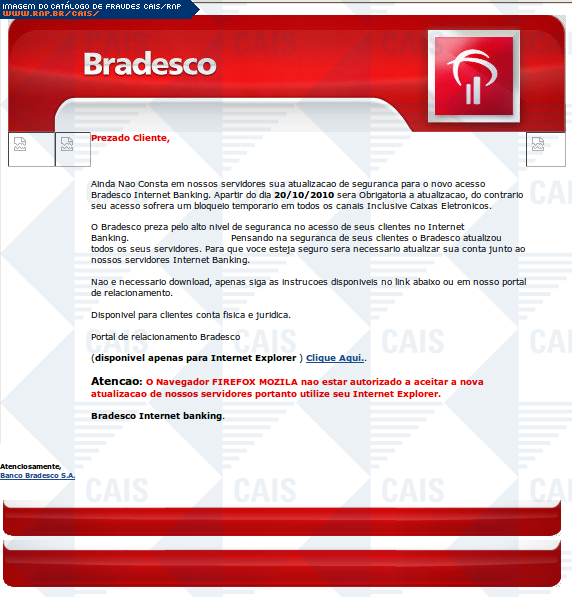 | comentário | Falso email do Banco Bradesco que solicita ao destinatário a realização de uma atualização de segurança para o acesso ao Internet Banking. Segundo o texto, a vítima deve acessar um link para recadastrar seus dados e para não ter o acesso ao Internet Banking... (leia mais) | |
