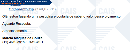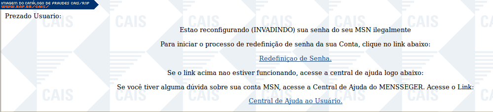 Esta página tem função informativa e educativa. Exibe uma coleção de imagens de phishing scam (fraudes eletrônicas) ou malware (código malicioso) veiculados por meio de spam (e-mail não-solicitado). Trata-se de conteúdo exemplificativo, não exaustivo, uma vez que não é possível contemplar todos os casos de fraudes existentes. Assim, caso você tenha conhecimento de um exemplar que não esteja aqui presente, isto não significa que não seja válido ou real. Inclusive incentivamos que você o envie para análise do CAIS para que, se for o caso, passe a integrar o nosso acervo.