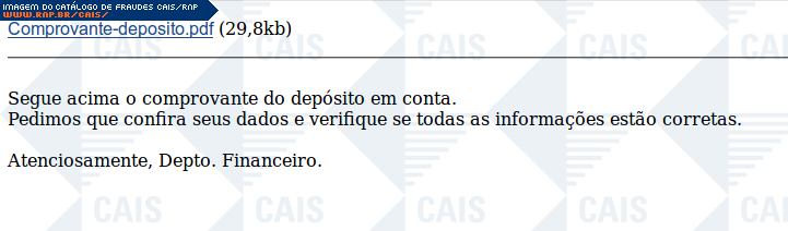 | comentário | Falsa mensagem informando sobre a realização de um depósito na conta da vítima. A mensagem contém um link para o suposto comprovante. Esse link leva ao download do arquivo malicioso TR/VB.Downloader.Gen (AntiVir). | |