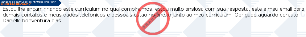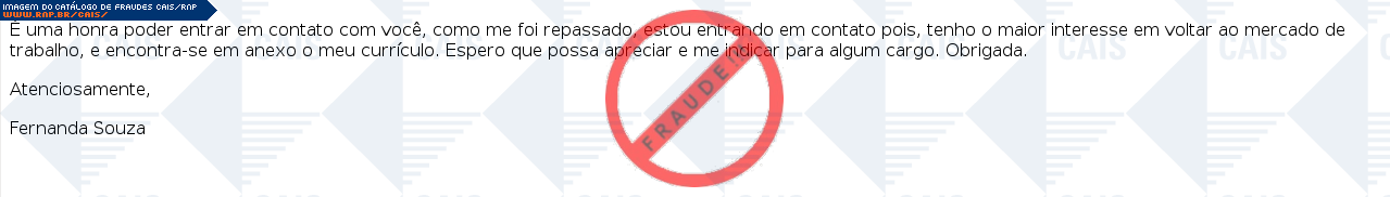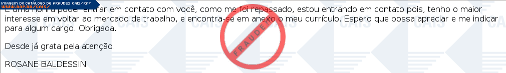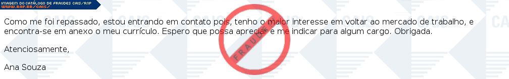 | comentário | O usuário recebe uma mensagem contendo um cúrriculo para análise disponível para download, no entanto o arquivo originado é malicioso criado para roubar informações da vítima e instalar outros arquivos fraudulentos com o nome de Trojan.Win32.Banker.ink. | |