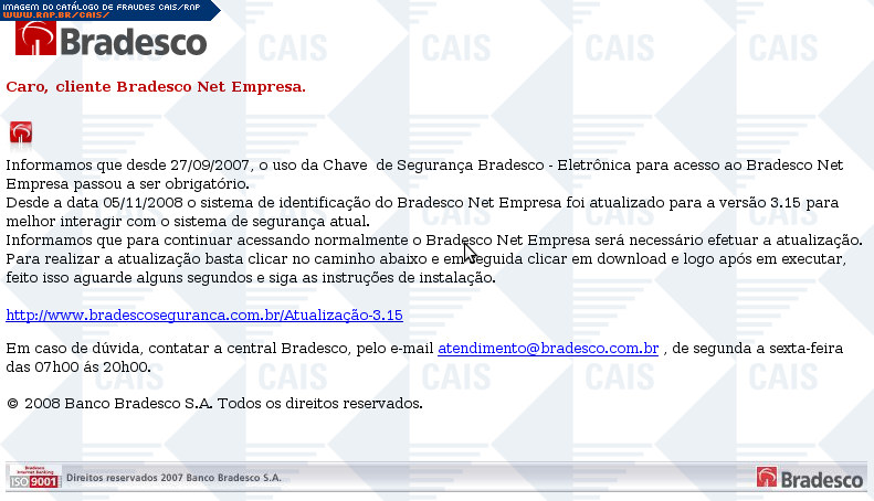 | comentário | Mensagem que se passa por um comunicado do banco Bradesco. A mensagem informa o usuário sobre a necessidade de atualização do Bradesco Net Empresa para a versão 3.15. O software malicioso é W32/Bancos.ACCC (Norman). | |