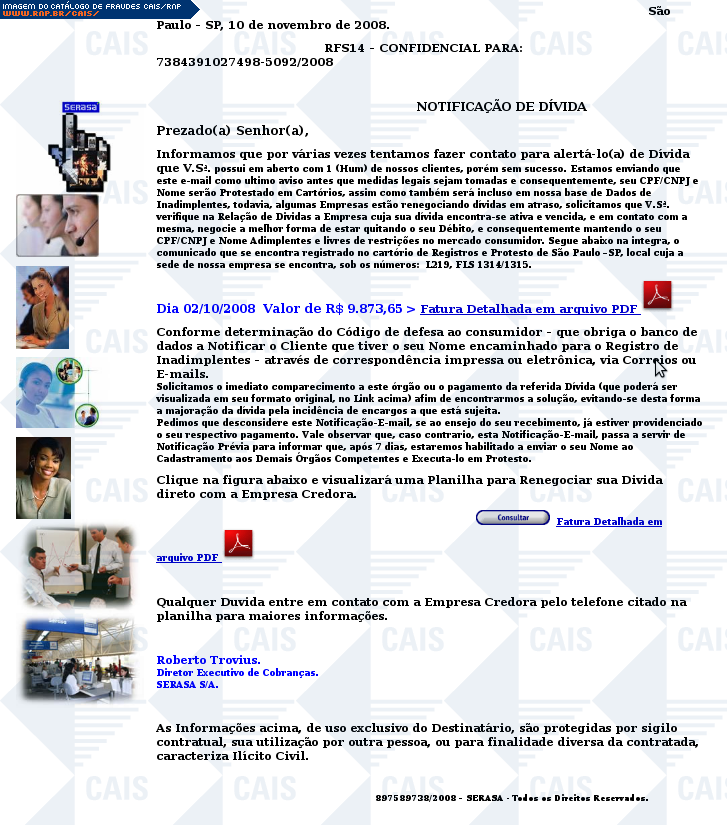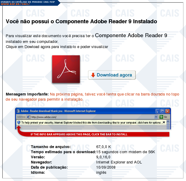 | comentário | Fraude composta por duas partes: uma mensagem e uma página. A mensagem se passa por um comunicado de débitos do SERASA. Ao clicar no link para a suposta "fatura detalhada" o usuário é levado a um site que informa que ele não tem o software Adobe Reader 9... (leia mais) | |