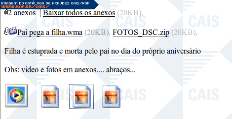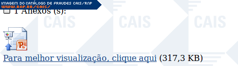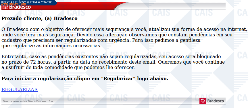 Esta página tem função informativa e educativa. Exibe uma coleção de imagens de phishing scam (fraudes eletrônicas) ou malware (código malicioso) veiculados por meio de spam (e-mail não-solicitado). Trata-se de conteúdo exemplificativo, não exaustivo, uma vez que não é possível contemplar todos os casos de fraudes existentes. Assim, caso você tenha conhecimento de um exemplar que não esteja aqui presente, isto não significa que não seja válido ou real. Inclusive incentivamos que você o envie para análise do CAIS para que, se for o caso, passe a integrar o nosso acervo.