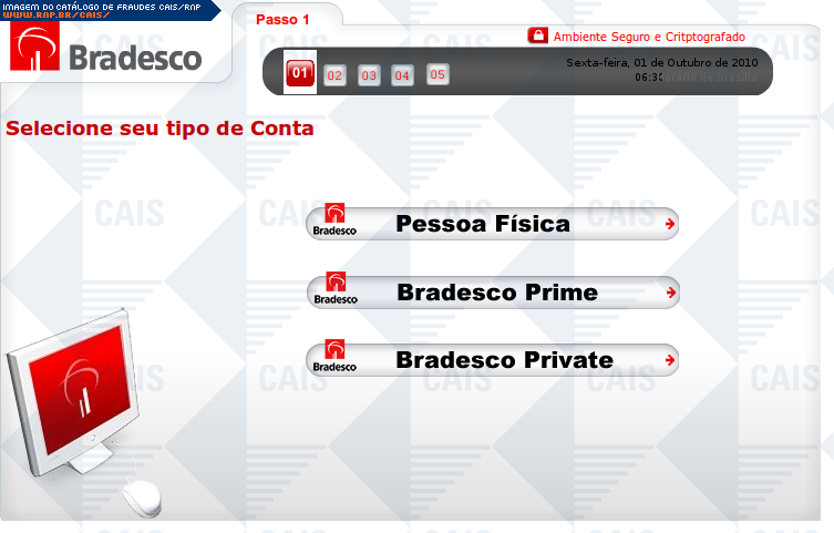 | comentário | O falso email alicia o usuário a entrar em uma página falsa do Banco Bradesco que rouba os dados bancários da vítima. Note que o link na barra de endereços não pertence ao Bradesco (baitcd.ru). | |