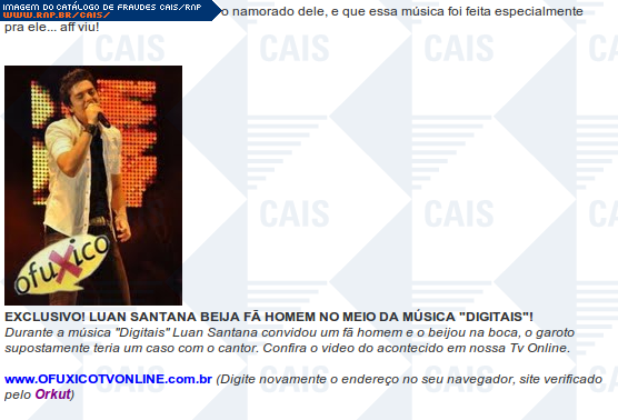 | comentário | Mensagem sendo veiculada por email através do site de relacionamentos Orkut. O link http://www.ofuxicotvonline.com.br hospeda uma página falsa do site ofuxico.com.br. No falso site, o usuário é instruído a fazer o download de um suposto plugin para visualização... (leia mais) | |