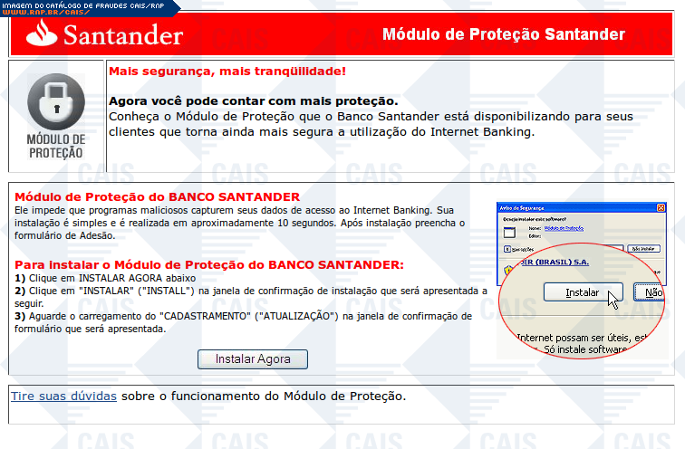 | comentário | O falso email alicia a vítima a atualizar o módulo de proteção Santander executando um programa de instalação, que na verdade é um arquivo malicioso identificado como Gen:Trojan.Heur.DP.8HW (BitDefender). | |