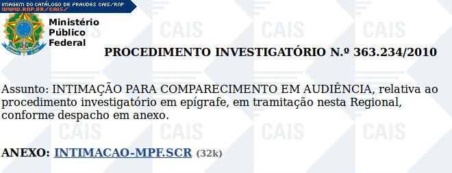 | comentário | Falso email do Ministério Público Federal dizendo que a vítima está intimada a comparecer em audiência. Note que o email do remetente não condiz com o texto do email; O email contém um falso anexo que leva a vítima ao download do arquivo malicioso identificado... (leia mais) | |
