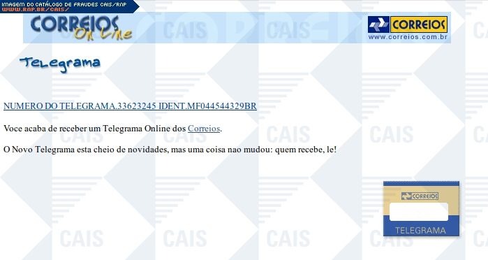 | comentário | Fraude que mostra um telegrama virtual supostamente enviado pelos Correios.O link leva a conteúdo malicioso que não estava disponível no momento da análise. | |