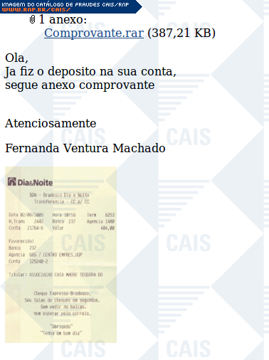 | comentário | Mensagem enviando em anexo suposto comprovante de depósito efetuado na conta da vítima. O link leva ao download de um malware identificado como Gen:Trojan.Heur.uO0arfpaysbG (BitDefender). | |