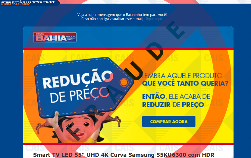 Esta página tem função informativa e educativa. Exibe uma coleção de imagens de phishing scam (fraudes eletrônicas) ou malware (código malicioso) veiculados por meio de spam (e-mail não-solicitado). Trata-se de conteúdo exemplificativo, não exaustivo, uma vez que não é possível contemplar todos os casos de fraudes existentes. Assim, caso você tenha conhecimento de um exemplar que não esteja aqui presente, isto não significa que não seja válido ou real. Inclusive incentivamos que você o envie para análise do CAIS para que, se for o caso, passe a integrar o nosso acervo.