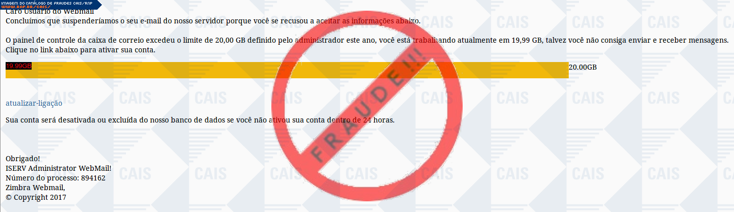 | comentário | A vítima recebe uma mensagem informando que por ter ultrapassado o limite de armazenamento do webmail, será necessário realizar a atualização do cadastro no link disponibilizado, no entanto a página é falsa destinada a roubar as informações do usuário. | |