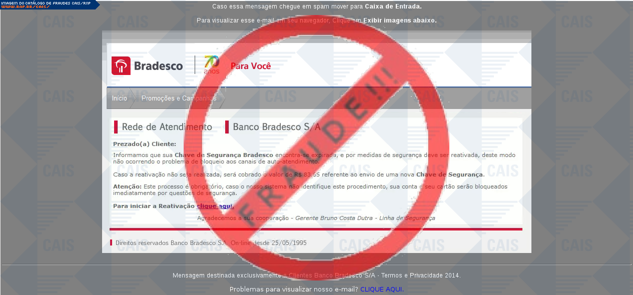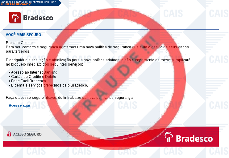Esta página tem função informativa e educativa. Exibe uma coleção de imagens de phishing scam (fraudes eletrônicas) ou malware (código malicioso) veiculados por meio de spam (e-mail não-solicitado). Trata-se de conteúdo exemplificativo, não exaustivo, uma vez que não é possível contemplar todos os casos de fraudes existentes. Assim, caso você tenha conhecimento de um exemplar que não esteja aqui presente, isto não significa que não seja válido ou real. Inclusive incentivamos que você o envie para análise do CAIS para que, se for o caso, passe a integrar o nosso acervo.