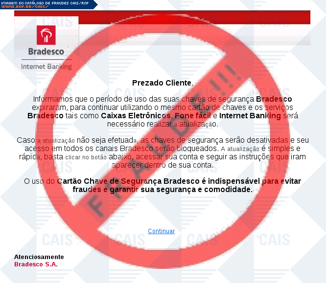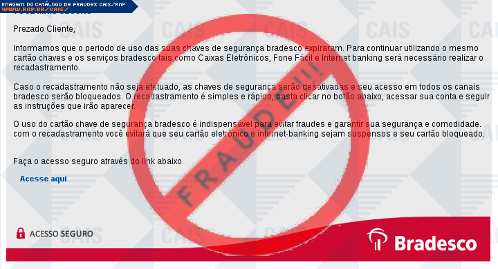 | comentário | O usuário recebe um e-mail informando que sua chave de segurança da conta do banco Bradesco expirou sendo necessário realizar uma atualização no link disponibilizado, entretanto a página fornecida é falsa criada para roubar os dados bancários da vítima. | |