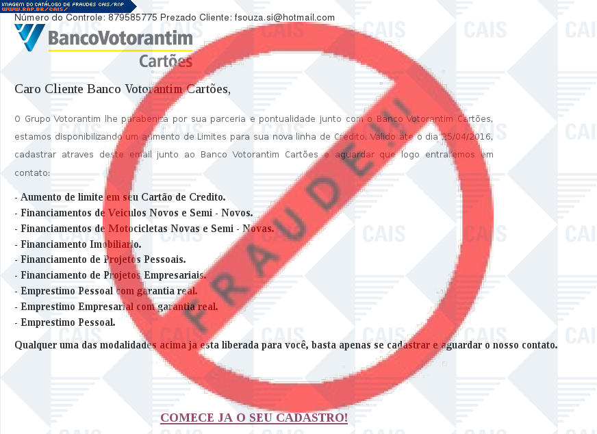 | comentário | A vítima recebe uma mensagem informando que sua conta no Banco Votorantim possui aumento de limite disponível sendo necessário apenas o cadastro, no entanto a página é falsa destinada a roubar as informações bancárias do usuário. | |