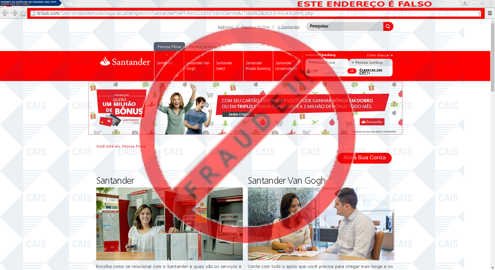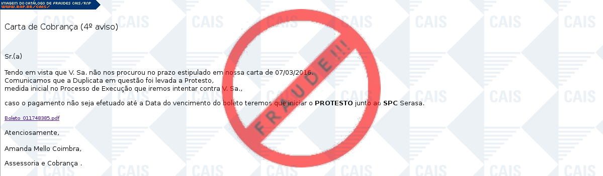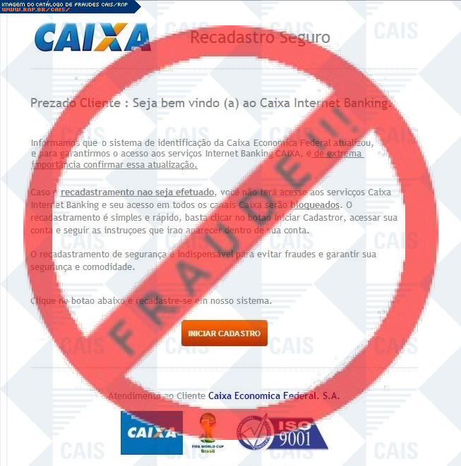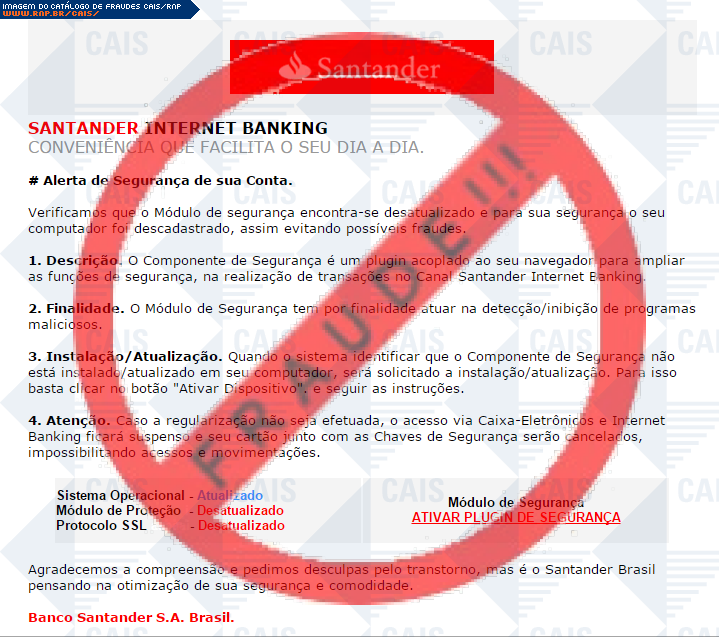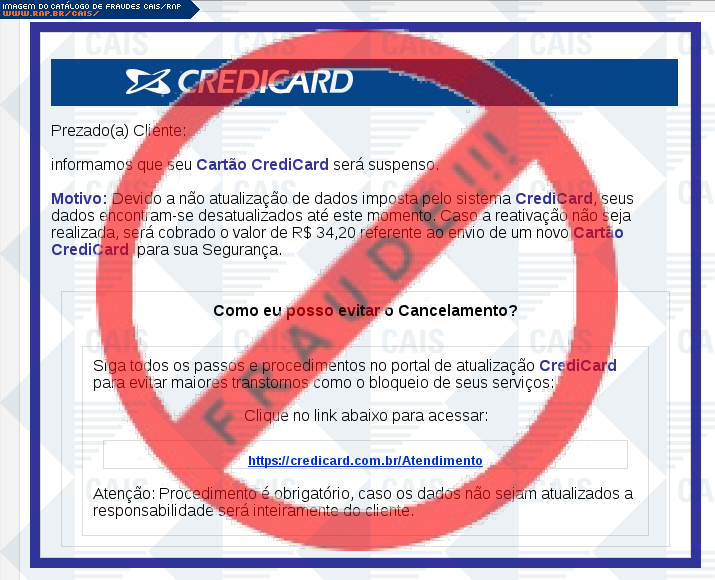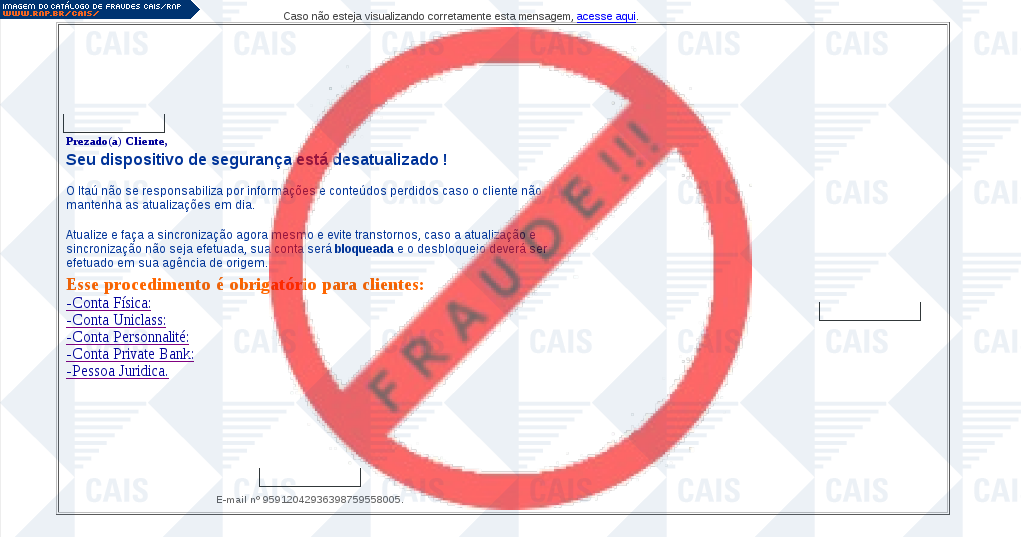 Esta página tem função informativa e educativa. Exibe uma coleção de imagens de phishing scam (fraudes eletrônicas) ou malware (código malicioso) veiculados por meio de spam (e-mail não-solicitado). Trata-se de conteúdo exemplificativo, não exaustivo, uma vez que não é possível contemplar todos os casos de fraudes existentes. Assim, caso você tenha conhecimento de um exemplar que não esteja aqui presente, isto não significa que não seja válido ou real. Inclusive incentivamos que você o envie para análise do CAIS para que, se for o caso, passe a integrar o nosso acervo.