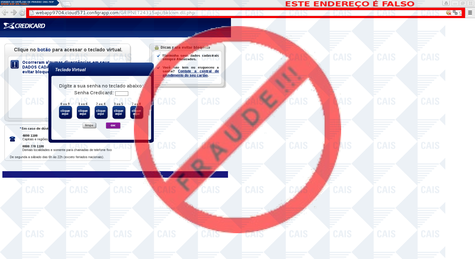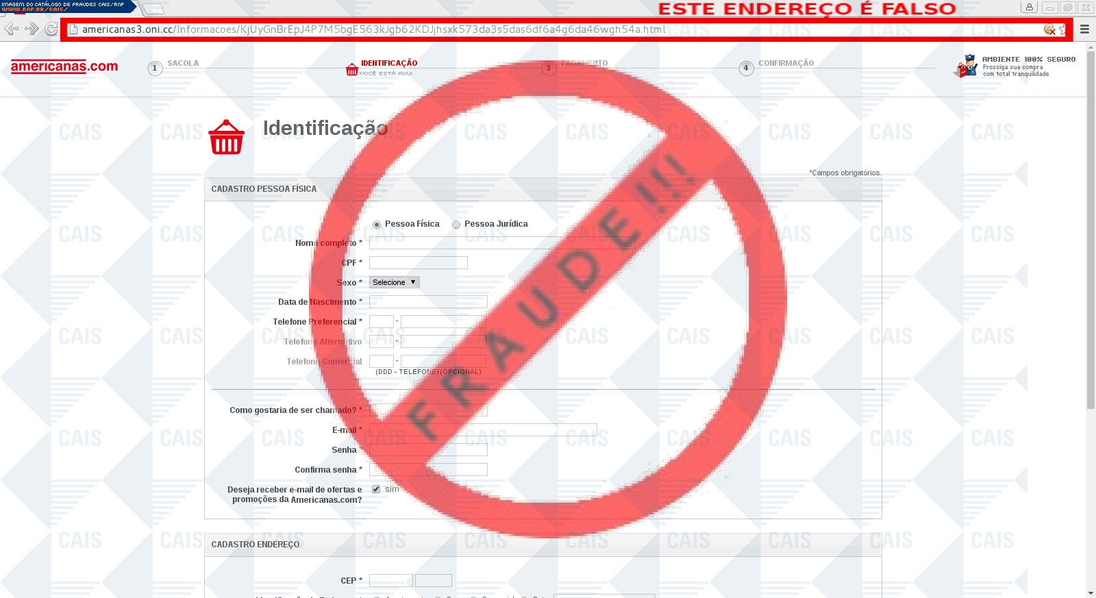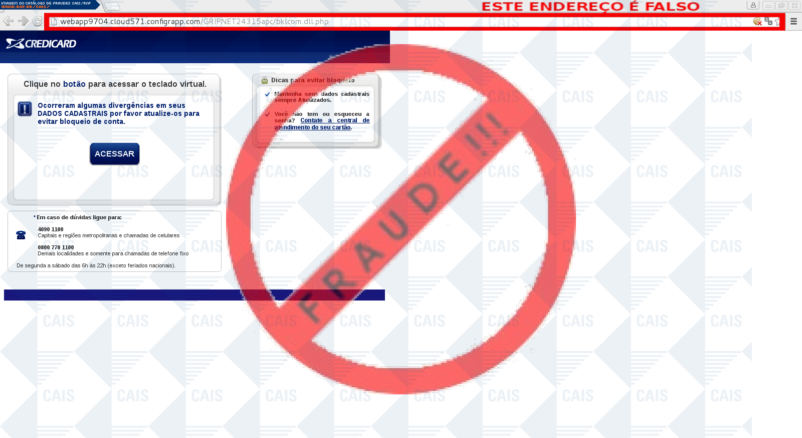 Esta página tem função informativa e educativa. Exibe uma coleção de imagens de phishing scam (fraudes eletrônicas) ou malware (código malicioso) veiculados por meio de spam (e-mail não-solicitado). Trata-se de conteúdo exemplificativo, não exaustivo, uma vez que não é possível contemplar todos os casos de fraudes existentes. Assim, caso você tenha conhecimento de um exemplar que não esteja aqui presente, isto não significa que não seja válido ou real. Inclusive incentivamos que você o envie para análise do CAIS para que, se for o caso, passe a integrar o nosso acervo.