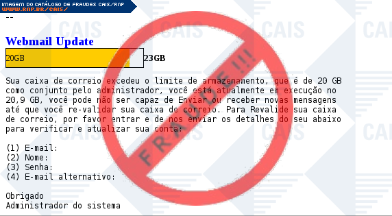 | comentário | O usuário recebe uma mensagem informando que a capacidade de armazenamento de sua conta de e-mail atingiu o limite sendo necessário responder o e-mail com algumas informações, no entanto o e-mail é falso criado para roubar os dados de login da vítima. | |