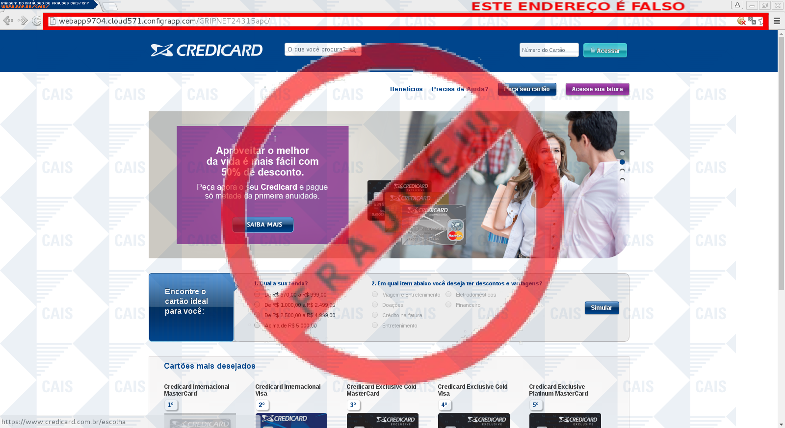 | comentário | A vítima recebe um e-mail informando que seu cartão credicard será suspenso estando o link para evitar que isso ocorra disponível, no entanto a página é falsa criada para roubar informações do usuário. | |