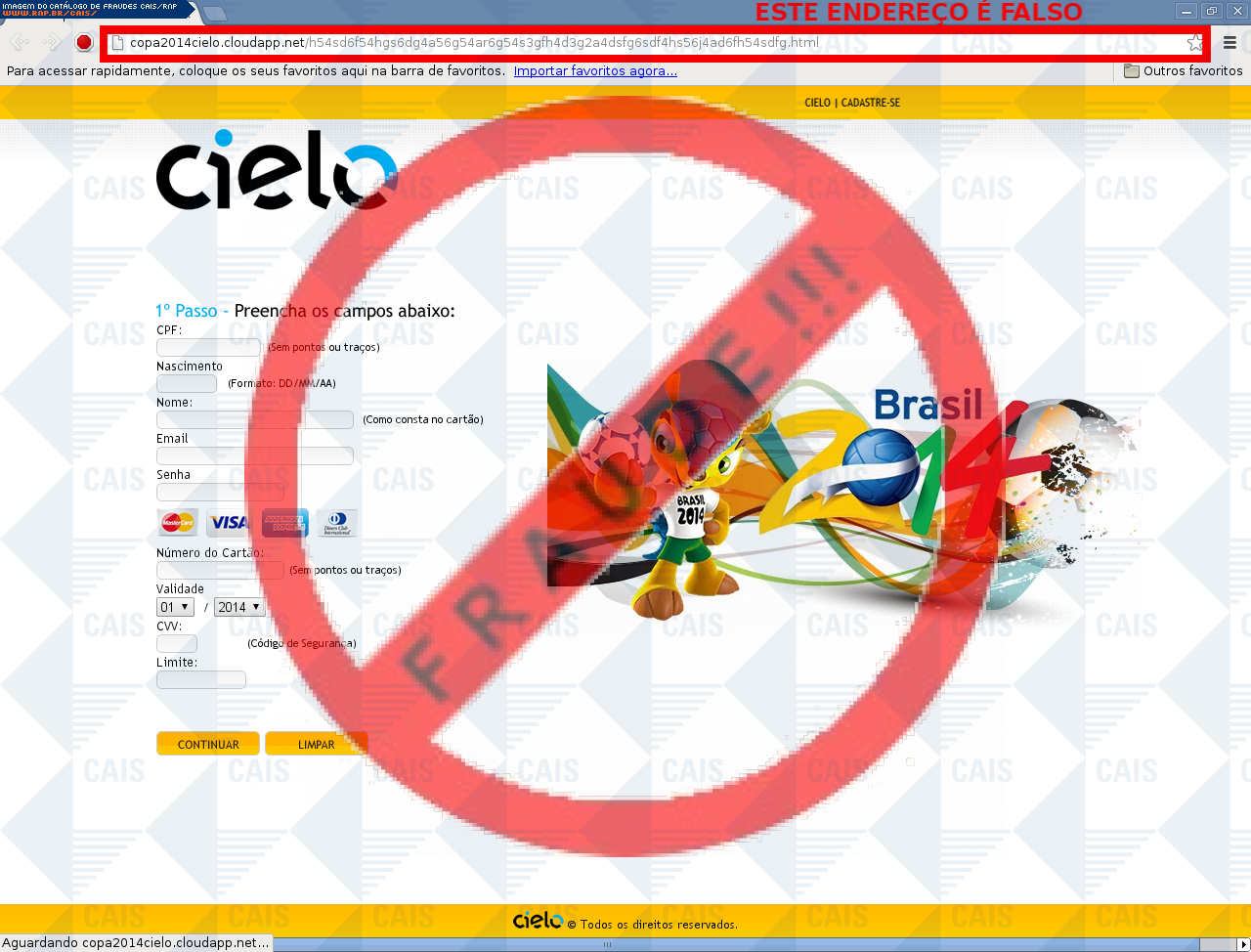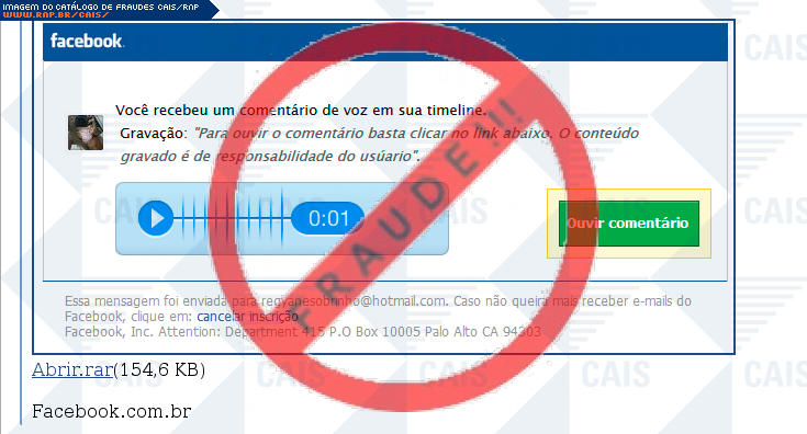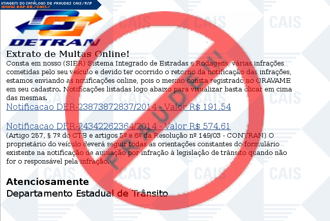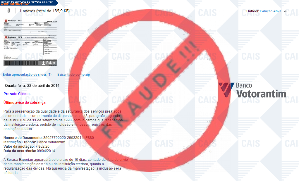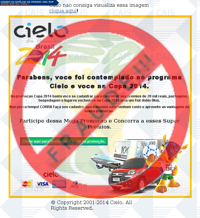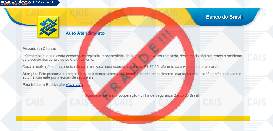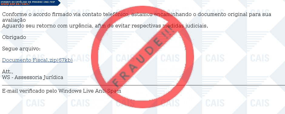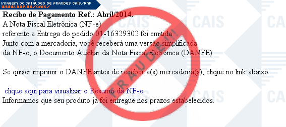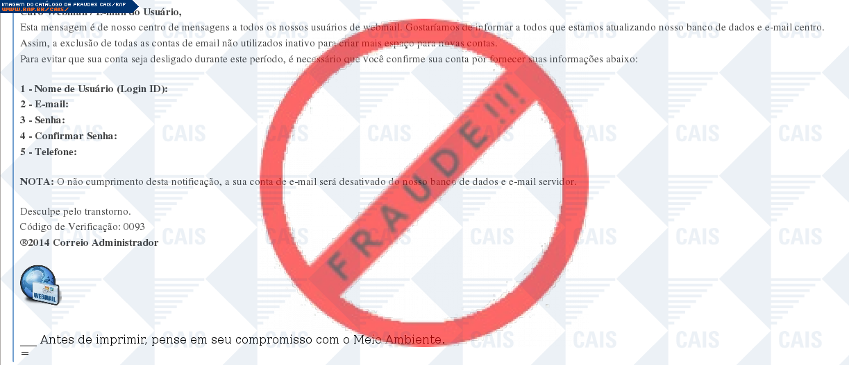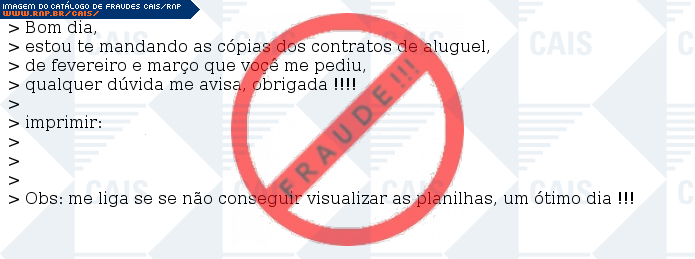 Esta página tem função informativa e educativa. Exibe uma coleção de imagens de phishing scam (fraudes eletrônicas) ou malware (código malicioso) veiculados por meio de spam (e-mail não-solicitado). Trata-se de conteúdo exemplificativo, não exaustivo, uma vez que não é possível contemplar todos os casos de fraudes existentes. Assim, caso você tenha conhecimento de um exemplar que não esteja aqui presente, isto não significa que não seja válido ou real. Inclusive incentivamos que você o envie para análise do CAIS para que, se for o caso, passe a integrar o nosso acervo.