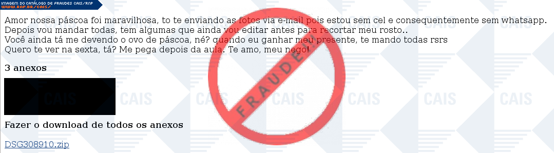 | comentário | A vítima recebe uma mensagem, contendo fotos íntimas que foram tiradas em uma festa, mas ao clicar no link para visualizá-las, inicia-se o download de um malware. | |
