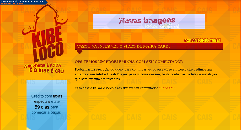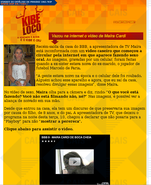 | comentário | Mais uma vez foi enviada uma fraude usando o vídeo de sexo da Maíra, ex BigBrother, como forma de enganar as vítimas e infectar seus computadores. Para aumentar a confiabilidade da mensagem, utilizaram uma página falsa do site KibeLoco, que possui um layout... (leia mais) | |