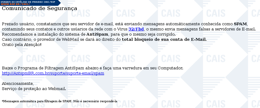 | comentário | Mensagem informando que seu servidor de e-mail está enviando SPAM para outros usuários, e que será necessário instalar o AntiSpam para que a sua conta não seja bloqueada. O arquivo malicioso não foi encontrado no momento da análise. | |