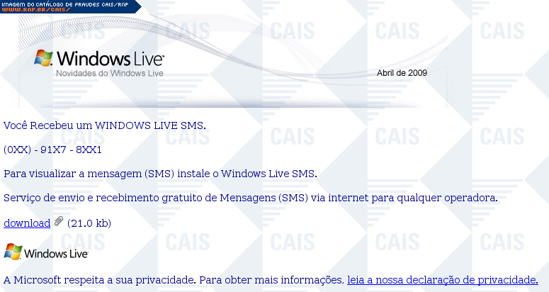 | comentário | Mensagem se passando por comunicado da Microsoft comunicando a respeito de recebimento de mensagem pelo Windows Live SMS. Para visualizar o torpedo a vítima deveria instalar o programa através de um link fornecido na mensagem. O link leva a um software malicioso... (leia mais) | |