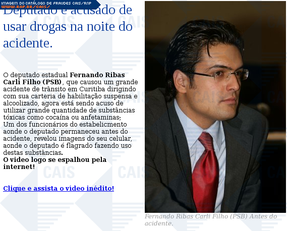 | comentário | Falsa notícia sobre acusação a deputado estadual do Paraná de que ele teria usado drogas na noite de um acidente no qual esteve envolvido. A notícia, com uma foto que seria do deputado, diz que o deputado consumiu bebida alcoólica e substâncias tóxicas como... (leia mais) | |