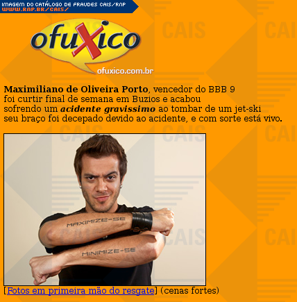 | comentário | Mensagem falsa com notícia de site de fofocas noticiando suposto acidente com último ganhador do BBB. Segundo a notícia ele teria ido a Búzios e acabou sofrendo acidente de jet-ski no qual teve o braço decepado. A mensagem possui um link que levaria a fotos... (leia mais) | |