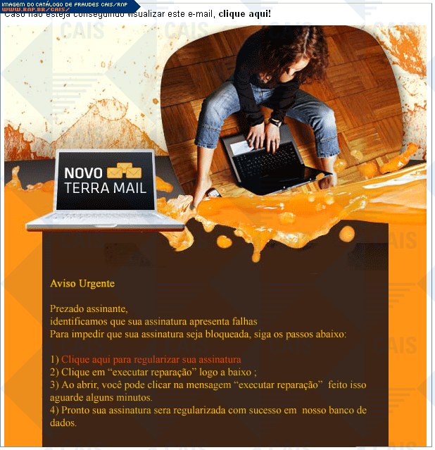 Esta página tem função informativa e educativa. Exibe uma coleção de imagens de phishing scam (fraudes eletrônicas) ou malware (código malicioso) veiculados por meio de spam (e-mail não-solicitado). Trata-se de conteúdo exemplificativo, não exaustivo, uma vez que não é possível contemplar todos os casos de fraudes existentes. Assim, caso você tenha conhecimento de um exemplar que não esteja aqui presente, isto não significa que não seja válido ou real. Inclusive incentivamos que você o envie para análise do CAIS para que, se for o caso, passe a integrar o nosso acervo.