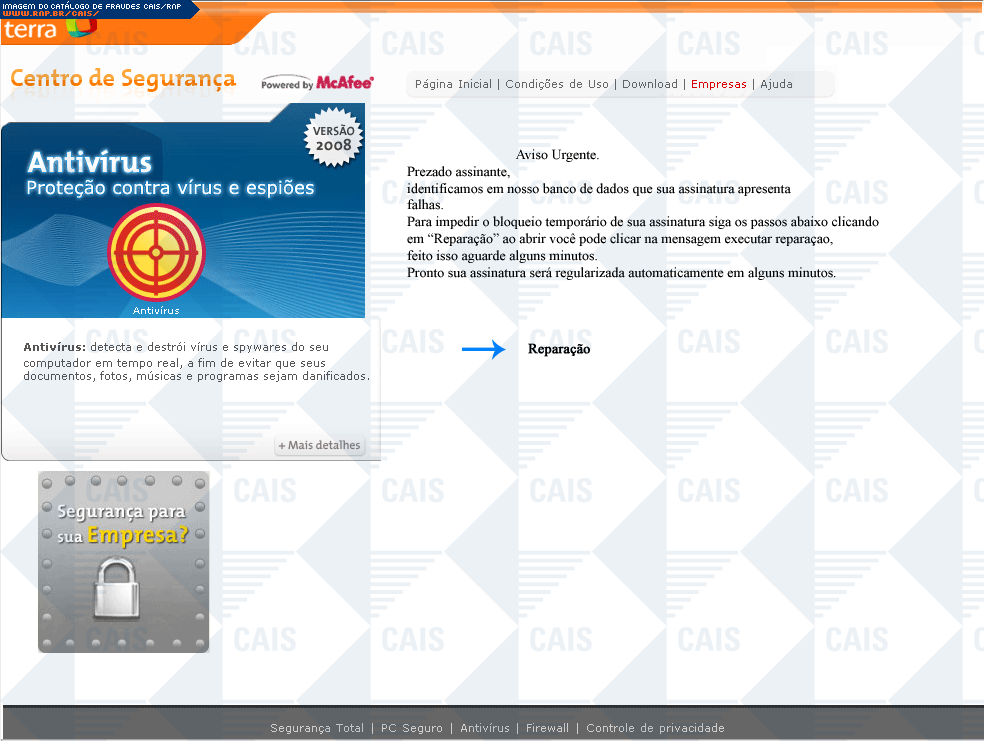 | comentário | Mensagem comunicando a vítima a respeito de problemas com sua assinatura no Terra. Para resolver o problema o texto sugere que é necessário acessar um link fornecido e baixar um arquivo de instalação para correção. O link leva a uma página falsa imitantdo... (leia mais) | |