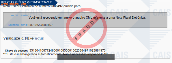 Esta página tem função informativa e educativa. Exibe uma coleção de imagens de phishing scam (fraudes eletrônicas) ou malware (código malicioso) veiculados por meio de spam (e-mail não-solicitado). Trata-se de conteúdo exemplificativo, não exaustivo, uma vez que não é possível contemplar todos os casos de fraudes existentes. Assim, caso você tenha conhecimento de um exemplar que não esteja aqui presente, isto não significa que não seja válido ou real. Inclusive incentivamos que você o envie para análise do CAIS para que, se for o caso, passe a integrar o nosso acervo.